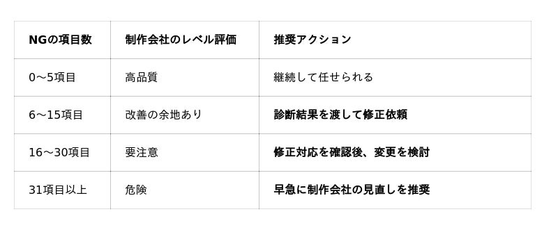 これらの項目がNGの場合、制作会社の基礎的な技術力・知識に重大な疑問が生じます。