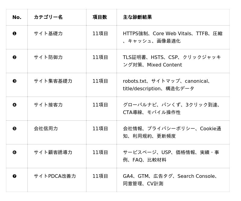 「集客」「問い合わせ」「売上」につながる『勝てる資格』が備わっているかを77項目・7カテゴリーで検証します。