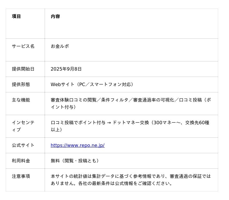 - お金ルポは、実際の審査体験口コミと統計データを可視化し、申込前に“近い条件の事例”から通過可能性のヒントを得られる比較・情報基盤を目指します。