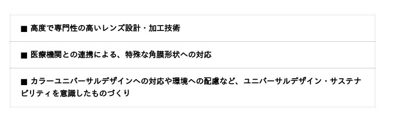 1971年の創業以来、眼科医療と連携しながら、一人ひとりの角膜形状に合わせたカスタムメイドのハードコンタクトレンズの研究・開発・製造・販売を行ってきました。