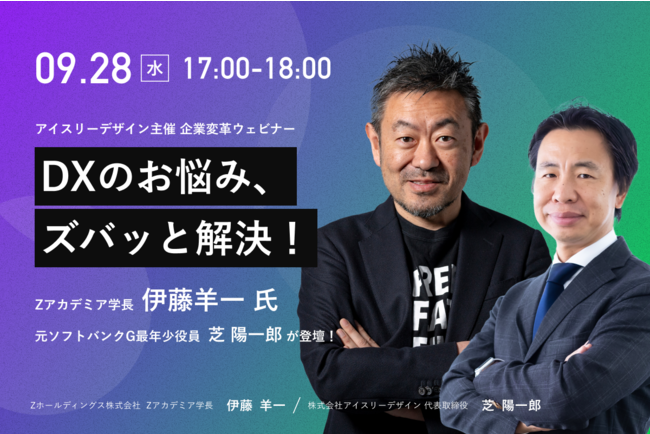 株式会社アイスリーデザイン(本社:東京都渋谷区、代表取締役:芝陽一郎、以下:アイスリーデザイン)は、「Zホールディングス株式会社 Zアカデミア学長 伊藤羊一氏 × 元ソフトバンクG最年少役員 芝 陽一郎が登壇!DXのお悩み、ズバッと解決!」をテーマに2022年9月28日(水)17時よりオンラインセミナーを開催いたします。