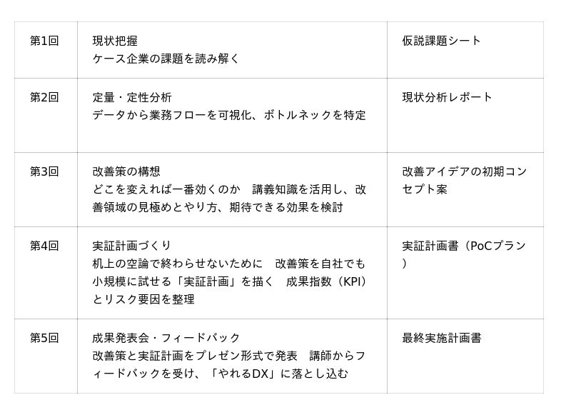 1.ビジネスデザインにおけるDXに特化したカリキュラム現状改善やツール導入による便利化にとどまらず、「将来どのような価値を提供する企業であるべきか」を起点に、ビジネスを再創造するためのDXにフォーカスします。サプライチェーンの再設計、顧客接点の変革、新規事業や製品開発への応用など、経営者視点の意思決定力を鍛えます。