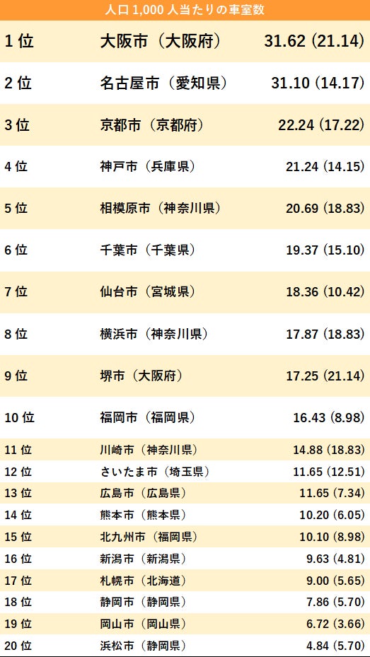 人口当たりの車室数が最も多い指定都市は大阪市でした。次いで、名古屋市、京都市、神戸市、相模原市と続いています。指定都市の中でも、上位と下位で数値に差が見られる結果となりました。