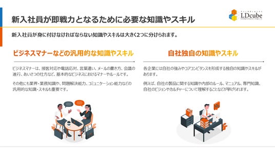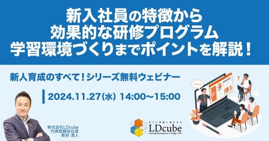 研修のスタイルにとらわれない企業向け人材育成サービスを提供する株式会社LDcube(本社:東京都千代田区、代表取締役社長:新井澄人、以下「当社」)は、WEBサイト上で「新入社員育成のすべて」企画編・実践編・カリキュラム編シリーズ3部作の資料ダウンロード数が増えていることを踏まえ、「新入社員の特徴から効果的な研修プログラム、学習環境づくりまでポイントを解説!」無料ウェビナーを開催いたしますので、お知らせいたします。