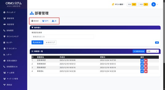 「事業部 − 部門 − 課」 の階層構造で管理できるようにしました。