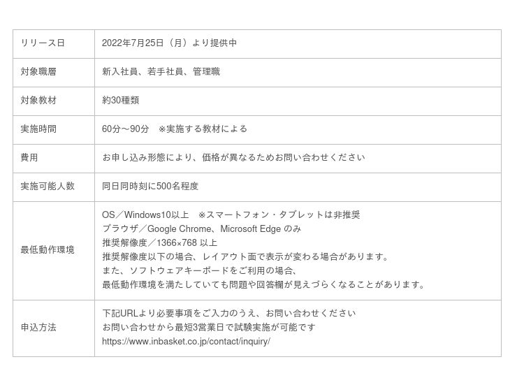 株式会社インバスケット研究所は、オンラインで500名同時に安定してアセスメント試験が実施できる能力測定専用WEBシステム「シンプルインバスケット」をリリースいたしました。