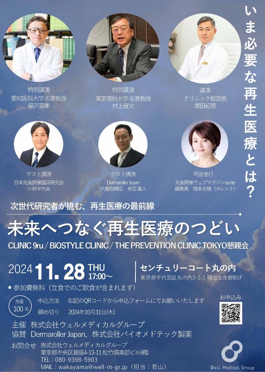 株式会社ウェルメディカルグループ(所在地:東京中央区/代表取締役社長:山ノ内辰二、以下当社)は、日頃より国内外から再生医療や先進予防医療をご希望されるお客様の架け橋としてご尽力くださっているメディカルエージェントの皆様に向けて、再生医療に関する有識者や医師をお招きし、「今必要な再生医療とは?」をテーマにした講演会を11月28日に開催することとなりました。