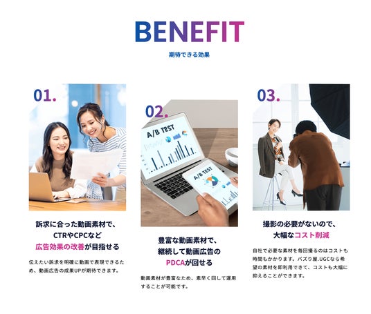 豊富な動画素材で、継続的に動画広告の運用を支えて、広告効果の改善をサポートする「バズり屋.UGC」は、多くの企業様、広告運用者様にご利用頂いております。