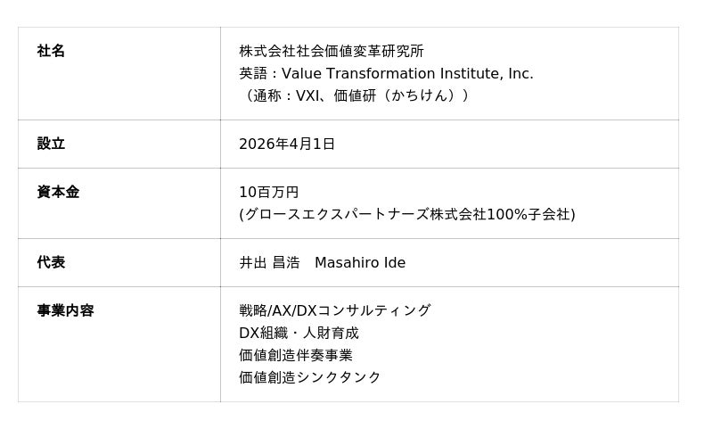 株式会社社会価値変革研究所(VXI)は、グロースエクスパートナーズグループの戦略コンサルティング子会社として2026年4月に設立されました。