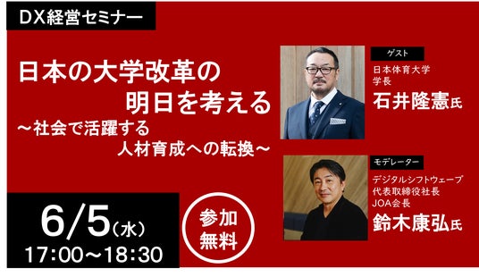 デジタルシフトウェーブは2024年6月5日、定例のDX経営セミナーを開催します。今回のテーマは「日本の大学改革の明日を考える~社会で活躍する人材育成への転換~」。日本体育大学の石井隆憲学長をゲストに迎え、大学教育の課題と、未来に向けた改革の実態に迫ります。
