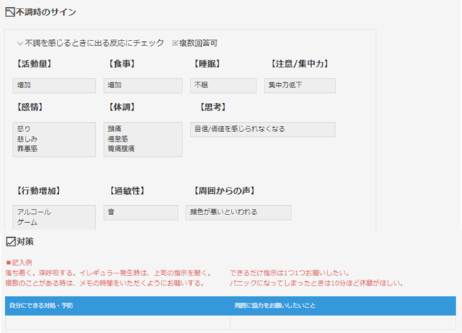 社員が自身の特性や困りごとなどを入力。定着支援関係者がモニタリングします。