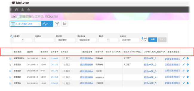 bloomはサイボウズ株式会社の業務改善プラットフォーム「Kintone(キントーン)」(※5)を活用して開発しています。就業定着状況を判断するため「体調管理」「生活習慣」「自己コントロール」「業務状況」などを指標として設定し、社員一人ひとりの面談などを通じて確認した数値や情報を一元管理しています。数値は定期的にモニタリングすることで、体調不良などでケアが必要な社員の早期発見や即時対応が可能です。また、システム化によって属人化リスクを回避し、支援業務プロセスを標準化できるため、定着支援業務の質の向上を実現できるほか、人員計画策定などの経営判断にも活用することができます。