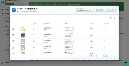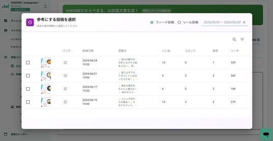 過去の伸びた投稿やベンチマーク先の投稿を選択することで、実際に成果が出ている投稿を参考に作成できます。