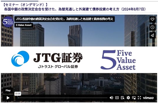 今回のオンデマンドセミナーは「各国中銀の政策決定会合を受けた、為替見通しと外貨建て債券投資の考え方」というテーマです。8月に入りブラックマンデー超えの下げ幅を記録した株価大暴落が発生しましたが、為替や各国の動向は投資家の皆様が投資を行う際のヒントになるものと考えております。今後も、当社は「外国債券のJTG証券」として債券ラインナップの拡充を通じてお客さまに多様な投資先と運用機会を引き続き提供すると共に、様々な情報提供を行ってまいります。