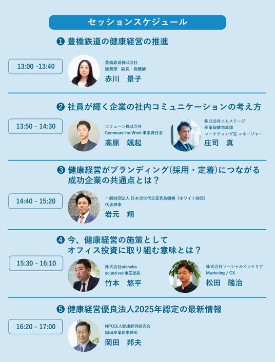 NPO法人健康経営研究会理事長の岡田 邦夫氏をはじめ、豊橋鉄道グループの健康経営推進を担当する保健師の赤川 景子氏など、7名の講師が登壇、5つのセッションで講演します。