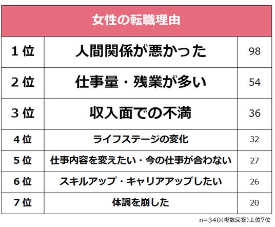 【調査結果サマリー】・女性340人が選んだ転職理由1位は「人間関係が悪かった」