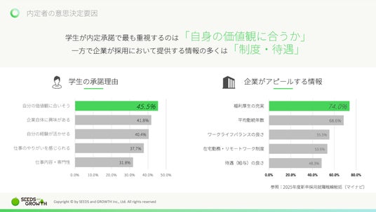 「仕事内容・キャリアビジョンの不一致」。一方、学生が内定承諾で最も重視するのは