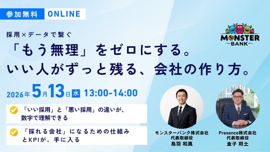 モンスターバンク株式会社モンスターバンク株式会社(東京都港区、代表取締役:鳥羽和真)は、2026年5月13日(水)に、Presence株式会社(代表取締役:金子将土)は採用コスト95%削減無料共同ウェビナーを開催いたします。