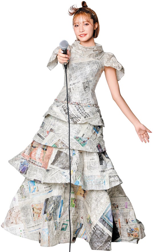 王林さんに着用いただいた特注の「新聞ドレス」は、PerfumeやYOASOBIのNHK紅白歌合戦の衣装制作も手がけたデザイナー・大岩大祐さんに依頼しました。全国さまざまな地域の新聞を使っています。