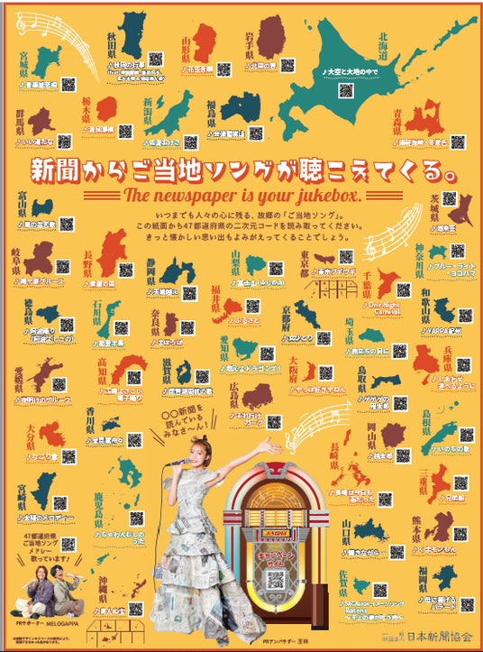 全国各地の新聞社が推薦し運営事務局が選んだご当地ソングを、紙面上の47都道府県の地図に併記された二次元コードからスマートフォンを通じYouTube動画で視聴いただきます。世代を超えて会話が広がるよう、各地域の情景を伝えることで新聞広告の魅力向上を目指すキャンペーンです。