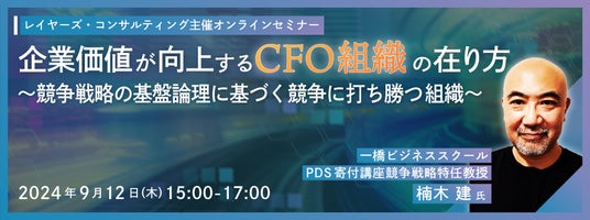 株式会社レイヤーズ・コンサルティング(東京都品川区、代表取締役CEO:杉野 尚志、以下:レイヤーズ)は、オンラインセミナー『企業価値が向上するCFO組織の在り方 ~競争戦略の基盤論理に基づく競争に打ち勝つ組織~』を2024年9月12日(木)に開催することを発表いたします。