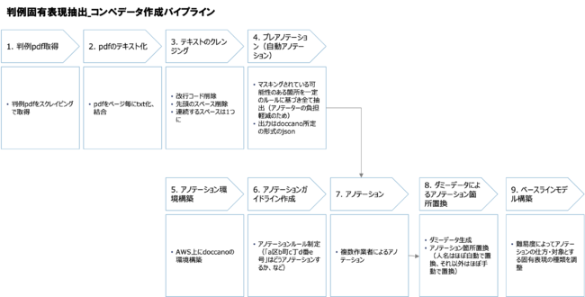 データは、Nishikaにて収集した判例文のpdfデータをテキスト化し、クレンジング後にテキストアノテーションツールdoccanoを用いて原文のマスキング箇所に対してアノテーションを行った後、架空の名称でアノテーション箇所を置換することにより作成