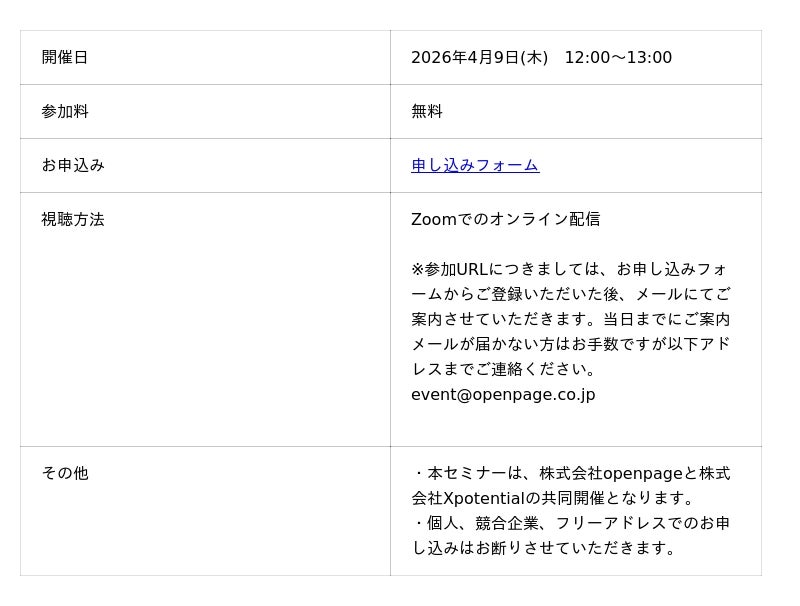 株式会社Xpotential(本社:東京都千代田区)は、「イネーブルメントが止まる壁と突破法~ROI設計・上申・現場浸透の実践ノウハウ~」をテーマに、2026年4月9日(木)12:00~13:00に株式会社Openpage(本社:東京都新宿区)と共催セミナーを開催いたします。