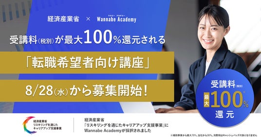 株式会社Shareway(シェアウェイ)(東京都杉並区:代表取締役 森田吏)が運営する、大人の自己実現をサポートするWebマーケター養成スクールWannabe Academy(ワナビーアカデミー)は、経済産業省「リスキリングを通じたキャリアアップ支援事業」の補助事業者に採択されました。転職支援として株式会社wannabeと加倉工業とコンソーシアムを結成し、キャリア相談、リスキリング講座の提供、転職支援、転職後のフォローアップまでをワンストップで実施いたします。