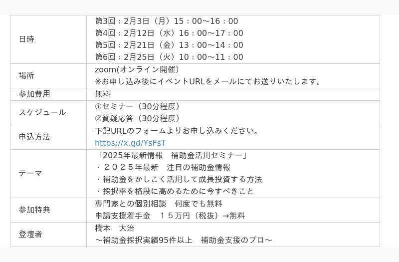 株式会社フラッグシップ経営は、2025年2月3日(月)、12日(水)、21日(金)、25日(火)に、小規模事業者・中小企業者を対象に最新の補助金情報について、オンラインセミナーを開催いたします。