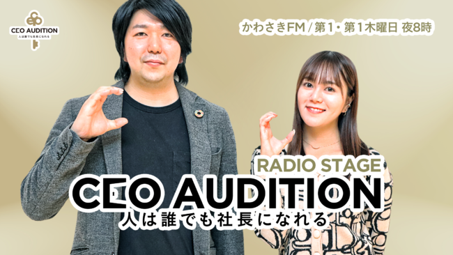 一般社団法人日本CEO協会(所在地:京都府京都市、代表理事:田中 千穂)が中心となり発足した社長輩出プロジェクト「CEOオーディション」は、かわさきFMにてCEOオーディションのラジオ番組「CEOオーディション Radio Stage」を2022年11月3日(木・祝)からスタートいたします。毎月第1・第3木曜日20:00~、番組尺29分の放送でお送りします。