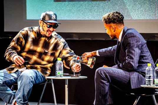 スポンサー企業の飲物を試飲する鈴木武蔵氏とKOJIMAN氏