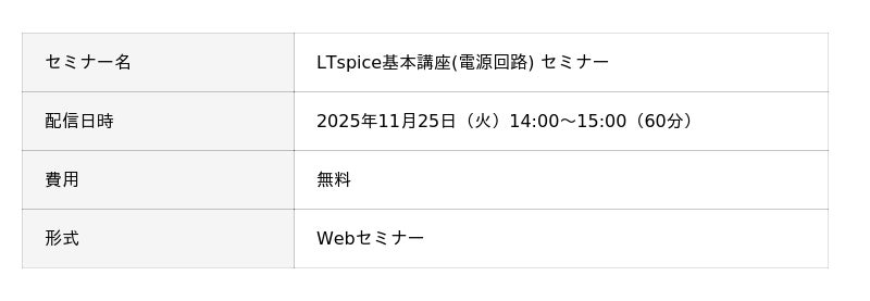 LTspiceをはじめて使用する方や新機能を知りたい方、電源回路のシミュレーションを検討している方を対象にLTspiceの基本操作と電源回路のシミュレーション方法の習得を目指します。