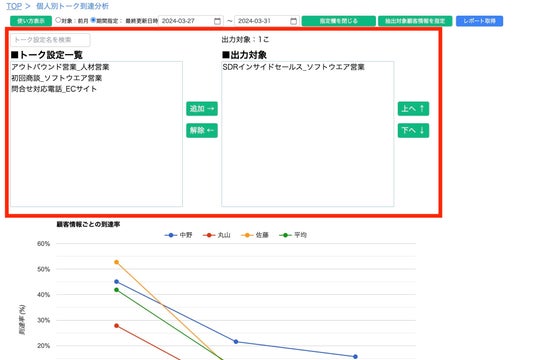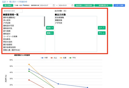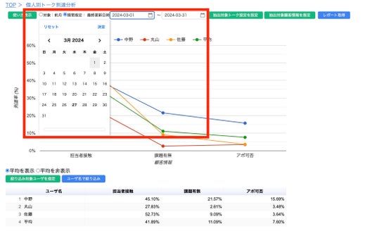 これにより、使えば使うほど、個人毎のKPI比較や差異があるポイントを探したり、会話の流れに沿って、どこを改善すればよいのかを見つけることができるグラフを、簡単に表示することが可能になります。