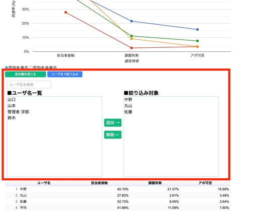 また「平均を表示」ボタンをおすと、対象メンバーの平均線がでるので、平均と比べて誰が、どのファネルで弱いのかなど簡単に確認できます。
