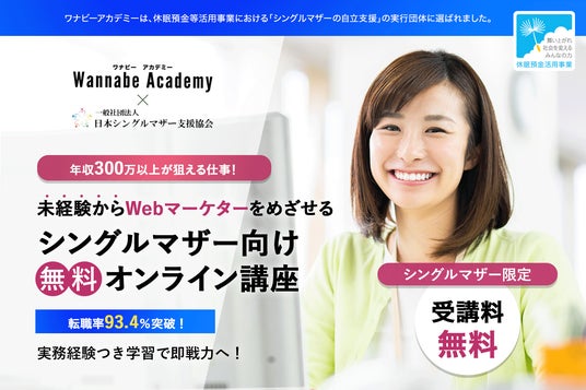 「なりたいを、あきらめない」を信念に掲げるとするWebマーケター養成スクールWannabe Academy(ワナビーアカデミー)を運営する株式会社Shareway(シェアウェイ)(東京都杉並区:代表取締役 森田吏)は、一般社団法人日本シングルマザー支援協会(神奈川県横浜市:代表理事 江成道子)が資金分配団体として採択された休眠預金活用事業「団体と自治体・企業との広範なネットワーク形成を通じてシングルマザーに対する自立支援パッケージの構築を目指す」の実行団体に選定されました。これにより、シングルマザーを対象にしたWebマーケティング講座の無償提供を開始します。講座を通じて新たなスキルを習得し、キャリアアップを目指せる機会を提供します。
