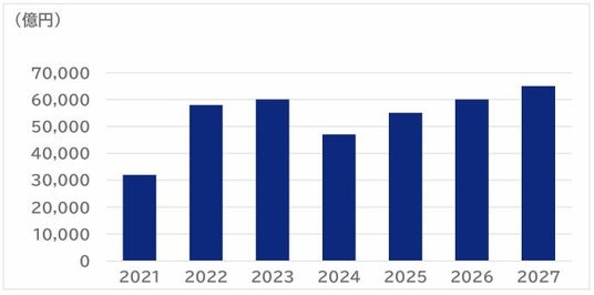 リチウムイオン電池(LiB)に不可欠な構成要素である電極材料は、近年、電気自動車(EV)の急速な普及を背景に、その需要が大きく拡大してきた。2023年には世界市場規模が6兆円に達し、2021年比で約2倍の成長を記録した。しかし、2024年に入ってからは、EV市場の一時的な減速および電極材料の供給過剰に伴い、価格下落が進み、出荷金額ベースで前年比20%以上のマイナス成長に転じたと推定される。需要は2024年を底に再び回復基調に入ると見られ、2026年には2023年水準に回復、2027年にはそれを上回る水準に拡大する見通しである。2030年以降、次世代電池の本格普及が始まるまでは、LiBの市場拡大が継続するものと予測される。地域別では、中国が最も大きな需要を示し、これに韓国や日本などが続く。製品別では、正極材の比重が大きい。
