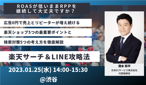 日本ECサービス株式会社(本社:東京都渋谷区、代表取締役:清水将平)は、楽天ショップにて、広告などを活用する前に対策しなければいけない5つの最重要ポイントと検索対策5つの考え方をテーマに、2023年1月25日(水)に渋谷にてセミナーを開催します。