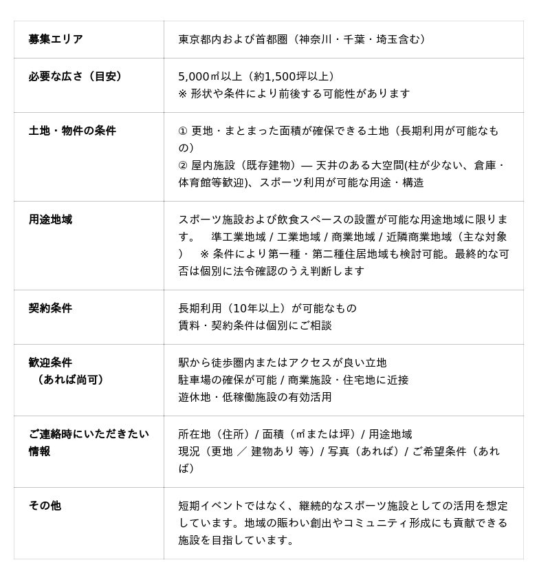 ■土地提供パートナー 募集要項ピックルボールコート(約20面)および飲食・休憩スペースを併設したスポーツ施設の開発を予定しており、適した土地・物件を募集しております。
