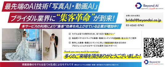 今回の展示会を通じて、多くのご来場者様から貴重なご意見やニーズを伺うことができ、改めてブライダル業界におけるAIモデル・AI広告写真の可能性と期待を実感いたしました。今後、株式会社Beyond AIは、今回ご紹介したソリューションのさらなる高度化と現場への導入支援を強化に推進してまいります。私たちは「人とAIで創る豊かな世界へ」を企業理念に、ブライダルに関わるすべての人がより豊かな時間と価値を創出できる未来を目指してまいります。