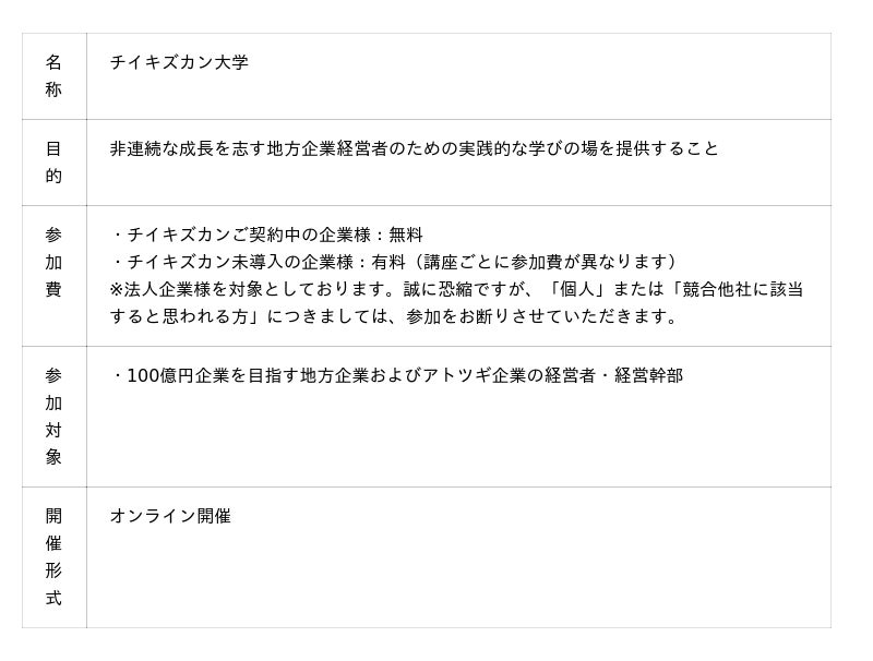 しかしその一方で、「どうすれば成長できるのか」「何から取り組めば良いのか」などと悩む地方企業経営者が多いのも事実です。そうした課題に応えるべく、チイキズカン大学では“明日から実践できる学び”を提供することを目的に、今後も、チイキズカンをご利用いただいている地方企業をはじめ、「100億円企業を本気で目指す地方経営者」の皆さまを対象に、より実務に直結した講座内容を継続的に展開してまいります。