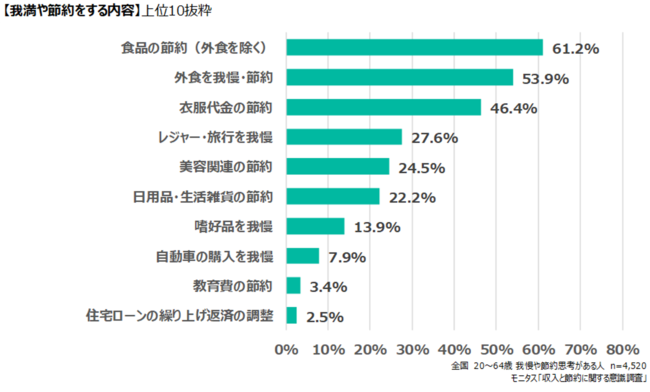 節約思考がある人における節約内容は、日々、消費のある「食品の節約(外食を除く)」が61.2%、「外食を我慢・節約」が53.9%と、食に関する内容が上位を締めました。続いて、「衣服代金の節約」が46.4%という結果になりました。