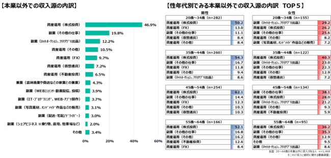 性年代別でみてみると、男性はすべての年代で「資産運用(株式投資)」がトップ。女性は年代によって傾向はやや異なるものの、54歳以下の年代では「副業(ネットオークション、フリマアプリ出品)」が上位にあがっている点が特徴的だと言えます。