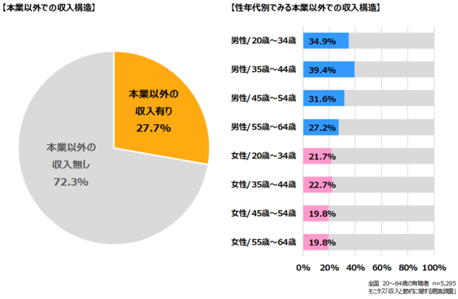 有職者5,295名に本業以外で収入を得ているかを聞いてみたところ、全体の約3割が本業以外で収入を得ているということがわかりました。