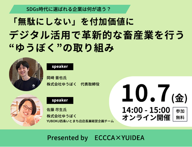 その取り組みの一環として、サステナブルな農場経営で大注目の企業、株式会社ゆうぼくをお迎えし、『「無駄にしない」を付加価値に、デジタル活用で革新的な畜産業を行う“ゆうぼく”の取り組み』と題したオンラインセミナーを、2022年10月7日(金)14:00-15:00に開催いたします。