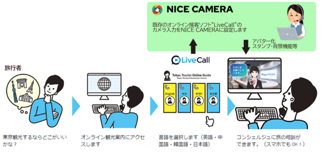https://livecall.jp)」のカメラ選択を、本人を映すWEBカメラではなく、事前にインストールしておいた仮想カメラアプリケーションソフトである自社サービス「NICE CAMERA(ナイスカメラ)」に切り替えるだけで、利用者の画面にアバターを映し出すことができます。