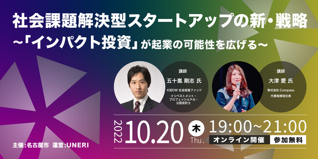 名古屋地域から社会起業家のエコシステム発展に向けた事業を展開する「株式会社UNERI」(本社:愛知県名古屋市 代表取締役 :河合将樹)は、2022年10月20日、名古屋市主催事業として開催する「社会課題解決型スタートアップの新・戦略 ~「インパクト投資」が起業の可能性を広げる~」にて運営事務局を務めます。