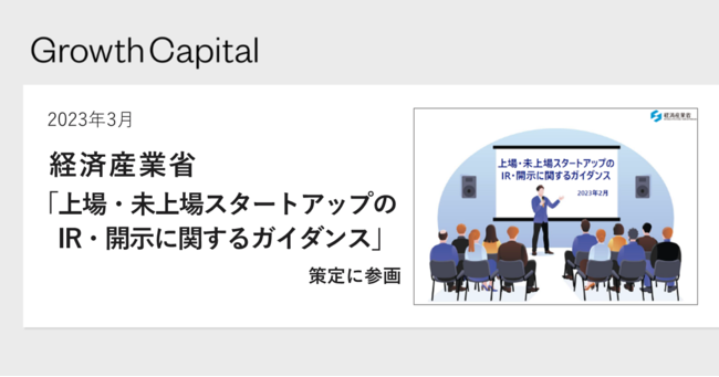 上場ベンチャーの事業成長を促す「攻めのファイナンス」を支援するグロース・キャピタル株式会社(本社:東京都港区、代表取締役CEO:嶺井政人、以下グロース・キャピタル)は、代表取締役CEO嶺井が経済産業省の「上場・未上場スタートアップのIR・開示に関するガイダンス」策定に参画したことをお知らせいたします。