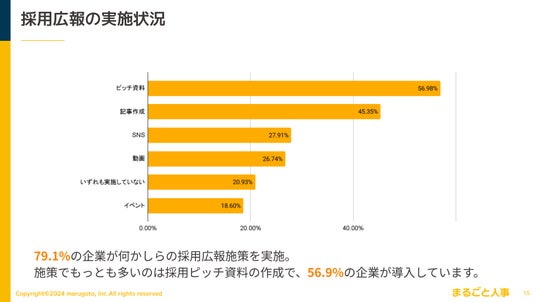 79.1%の企業が採用広報施策を実施。79.1%の企業が何かしらの採用広報施策を実施していると回答。施策でもっとも多いのは採用ピッチ資料の作成で、56.9%の企業が導入しているという結果になりました。