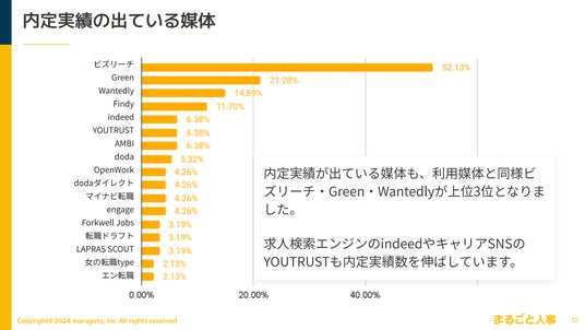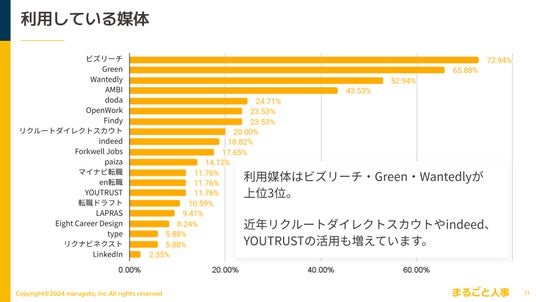 ベンチャー企業の中途採用において、もっとも活用されている媒体はビズリーチ。72.9%の企業が導入。利用している媒体はビズリーチ・Green・Wantedlyが上位3位となりました。内定実績もビズリーチがもっとも高い結果になりました。求人検索エンジンのindeedやキャリアSNSのYOUTRUSTも内定実績数を伸ばしています。