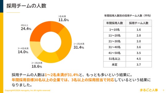 採用チームのリソースは、年間採用人数1~10名の企業で1.6名、11~20名の企業で2.8名という結果に。採用チームの人数は1~2名未満が31.4%と、もっとも多いという結果に。年間採用人数別の採用チーム人数の平均は、年間採用目標1~10名の企業で1.6名、11~20名の企業で2.8名となりました。